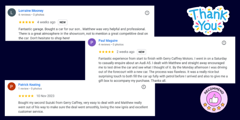 Since 1987, Gerry Caffrey Motors has been helping drivers across Dublin find their perfect car from our showroom at 112 Terenure Road North. Over the years, we’ve learned that Google customer reviews are one of the most honest measures of how we’re doing and we take them seriously.