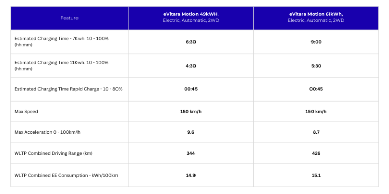 It's also available in a range of stylish colours from Pearl White to Celestial Blue Pearl, both in single or dual tone along with interior mood lightening and a whole new grill look. The new eVitara is a stylish EV option and one that will turn heads. You can check out all the colour options here.